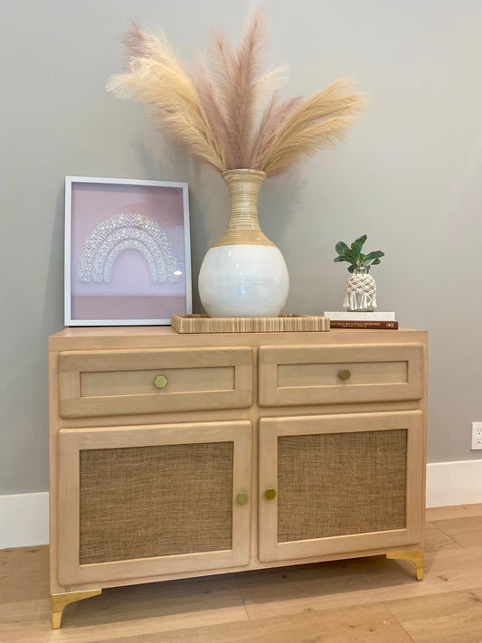 Refinished white oak cabinet with burlap doors & gold hardware 44"