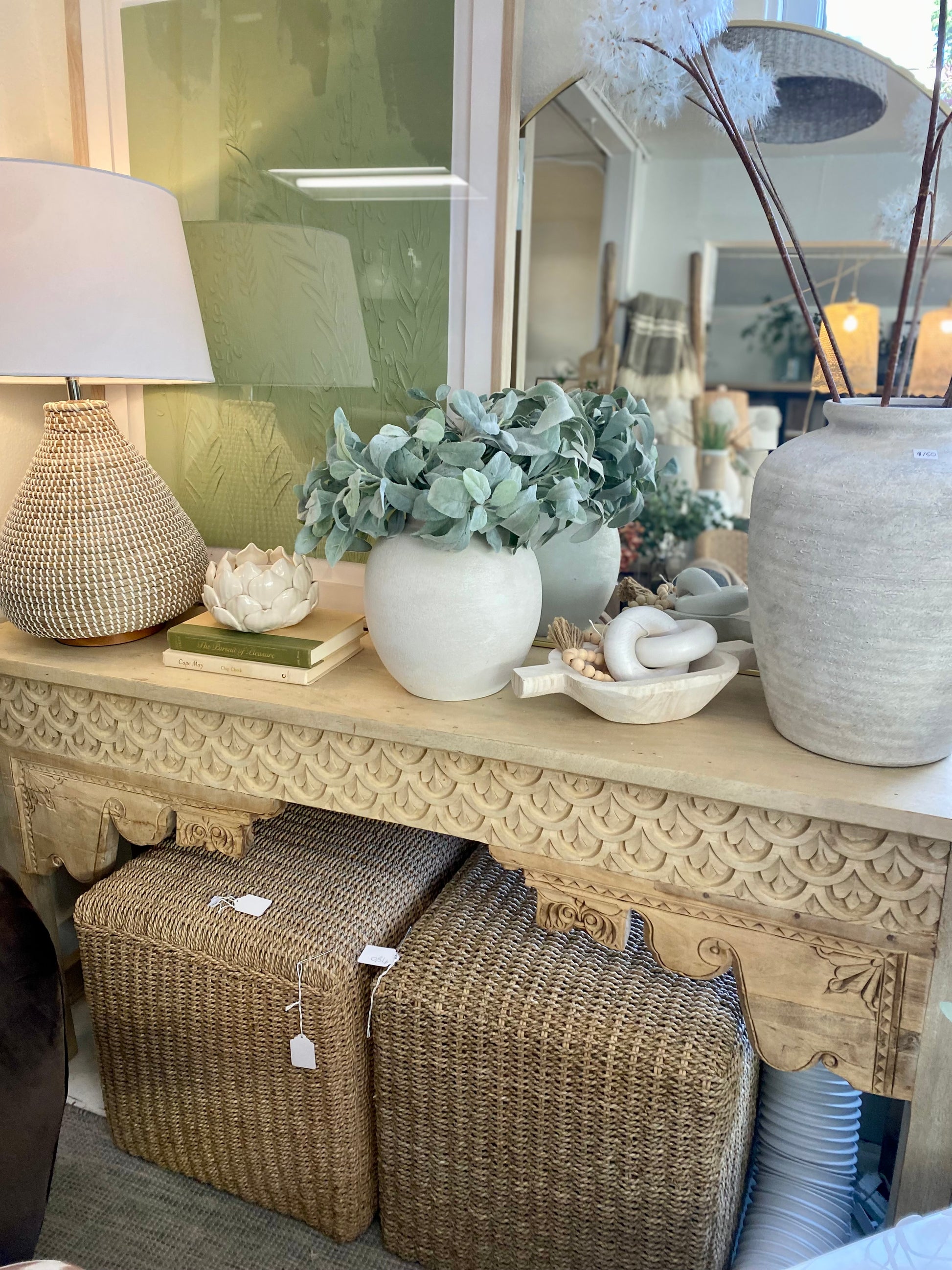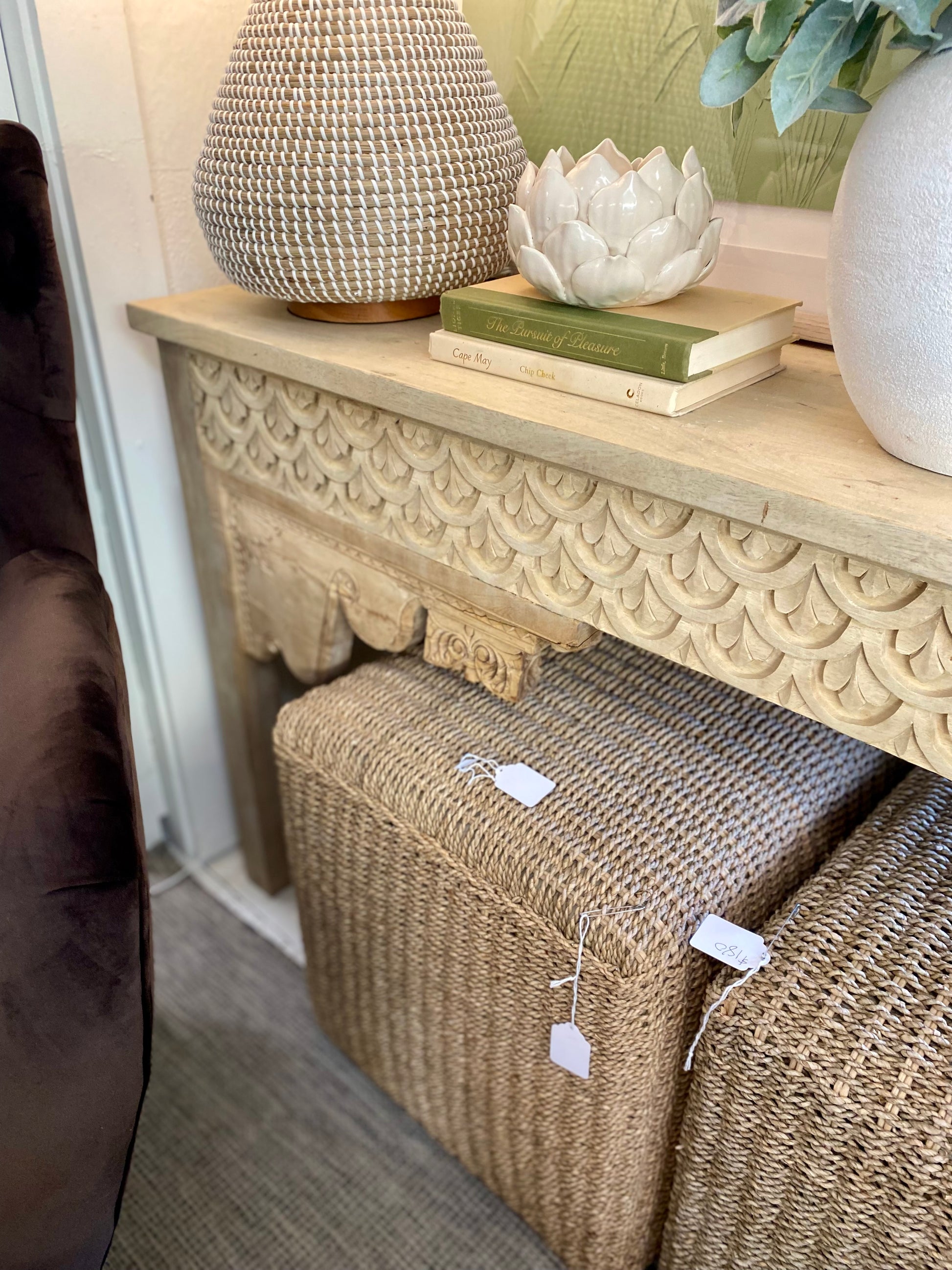 The hand-carved detail on the front of the Architectural Salvage Console Table is striking. Made of solid vintage wood that is sandblasted and bleach finished, the Architectural Salvage Console Table is a striking entry or accent table.